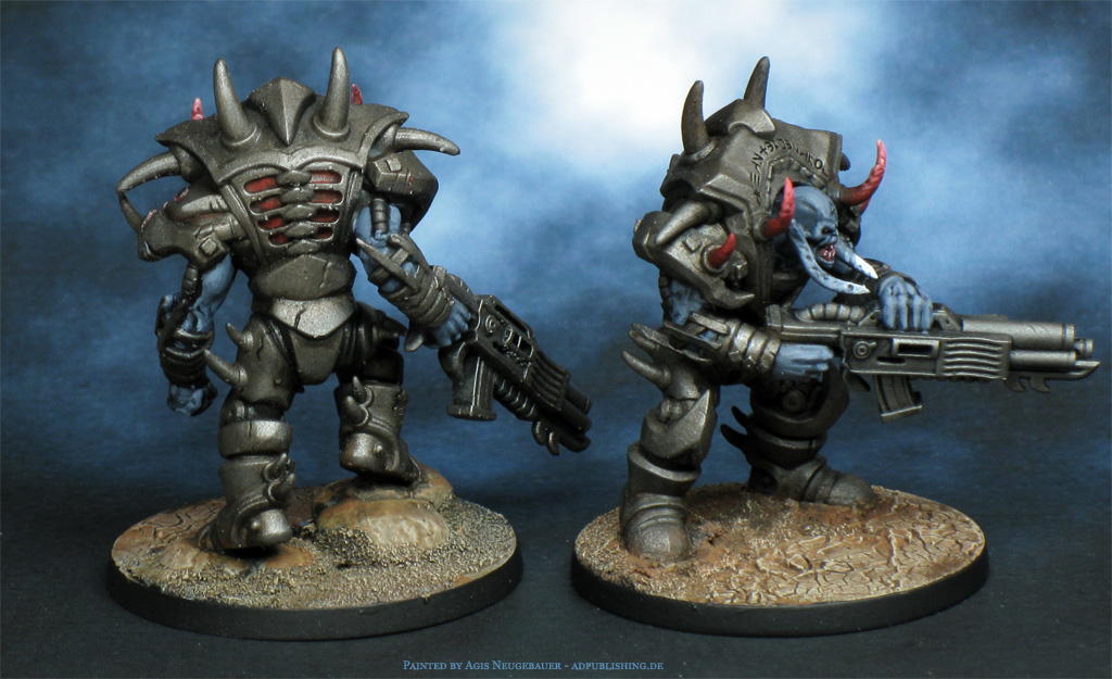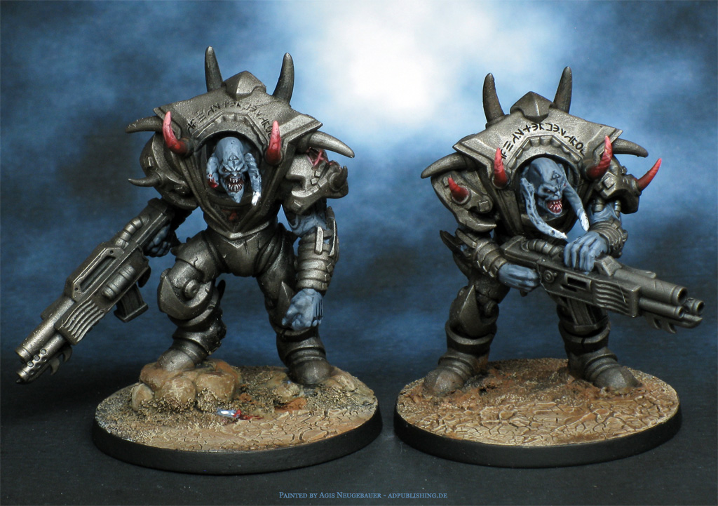 The Praetorian Stalkers are elite shock troops of the Dark Legion, created through a fusion of necrotechnological sorcery and corrupted flesh. Serving primarily under the Apostle Algeroth, they embody ruthless efficiency, speed, and stealth. Grown within the bio-forges of the Dark Citadels, Stalkers are engineered to be perfect hunters—swift, silent, and utterly loyal to the will of the Dark Apostles. Clad in living armor and armed with a mix of close-combat weapons and necro-powered firearms, Praetorian Stalkers excel at infiltration, assassination, and targeted strikes against the megacorporations of the Solar System. Their reflexes are superhuman, their senses preternaturally sharp, and their minds shielded from fear or hesitation. Wherever they appear, they act as harbingers of Algeroth’s military campaigns, eliminating officers, disabling defenses, and causing chaos behind enemy lines. Feared for their ability to strike without warning and vanish just as quickly, the Praetorian Stalkers represent one of the Dark Legion’s most terrifying and efficient instruments of war.