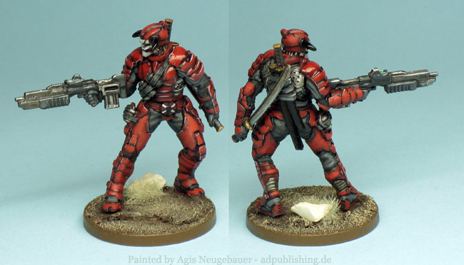 “Crimson Devils are an unusual military regiment that is not considered to be a part of the Mishiman armed forces. Instead they are ‘officially’ classed a military-triads hybrid. Their battlefield role centres on ruthless surgical strikes where they sow death, terror and confusion. Only the Ronin Samurai, who have already lost their own honour, are allowed to train Crimson Devils. The Crimson Devils favour close combat and the use of the Ceremonial Katana, but are also trained to use standard-issue Mishiman firearms. Crimson Devils are ornately dressed in shades of red, with masks that bear the twisted and unsettling faces of mythical Oni-Demons. The surgically attached mask seals the unscarred faces of the wearer behind specially designed breathing apparatus, protecting them from even the most polluted air of the Solar Systems. The masks may only be removed by experts on the request of the Liege-Lords and to attempt removal otherwise would rip flesh from the face of it’s bearer in an agonising and mutilating wound.”