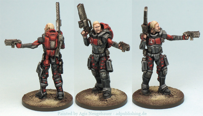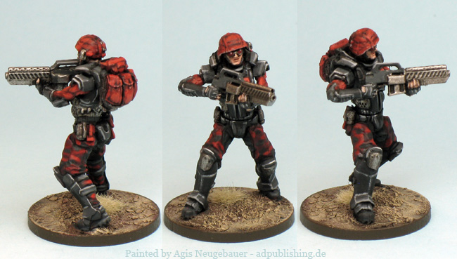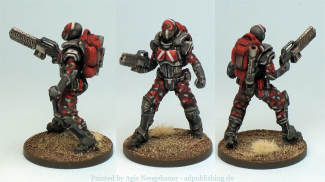 The above mini is from the Warzone Resurrection KS, I did a head swap however. The Light Infantry helmet is true to the original artwork, but somehow it does not work for me. After that the mini was mounted on a 25 mm MDF base.