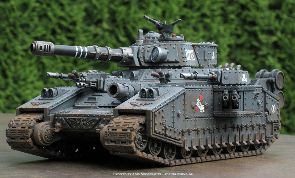 Not much at the moment. A Forge World Mars Alpha Pattern Leman Russ Vanquisher with Coaxial Heavy Stubber, filter, trench rail modification and a Death Korps of Krieg Tank commander with Heavy Stubber. I only did not use the trench rails on the kit, they were too much WW I for my taste.