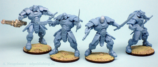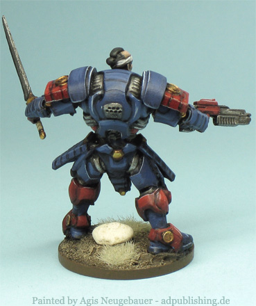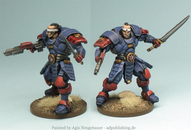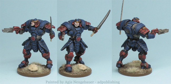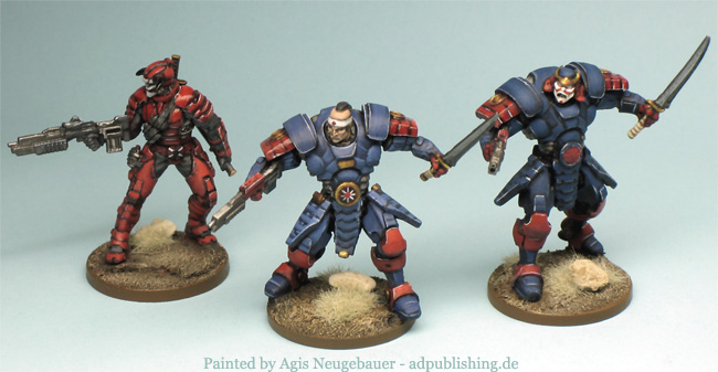 “Crimson Devils are an unusual military regiment that is not considered to be a part of the Mishiman armed forces. Instead they are ‘officially’ classed a military-triads hybrid. Their battlefield role centres on ruthless surgical strikes where they sow death, terror and confusion. Only the Ronin Samurai, who have already lost their own honour, are allowed to train Crimson Devils. The Crimson Devils favour close combat and the use of the Ceremonial Katana, but are also trained to use standard-issue Mishiman firearms. Crimson Devils are ornately dressed in shades of red, with masks that bear the twisted and unsettling faces of mythical Oni-Demons. The surgically attached mask seals the unscarred faces of the wearer behind specially designed breathing apparatus, protecting them from even the most polluted air of the Solar Systems. The masks may only be removed by experts on the request of the Liege-Lords and to attempt removal otherwise would rip flesh from the face of it’s bearer in an agonising and mutilating wound.” (from Prodos webside)